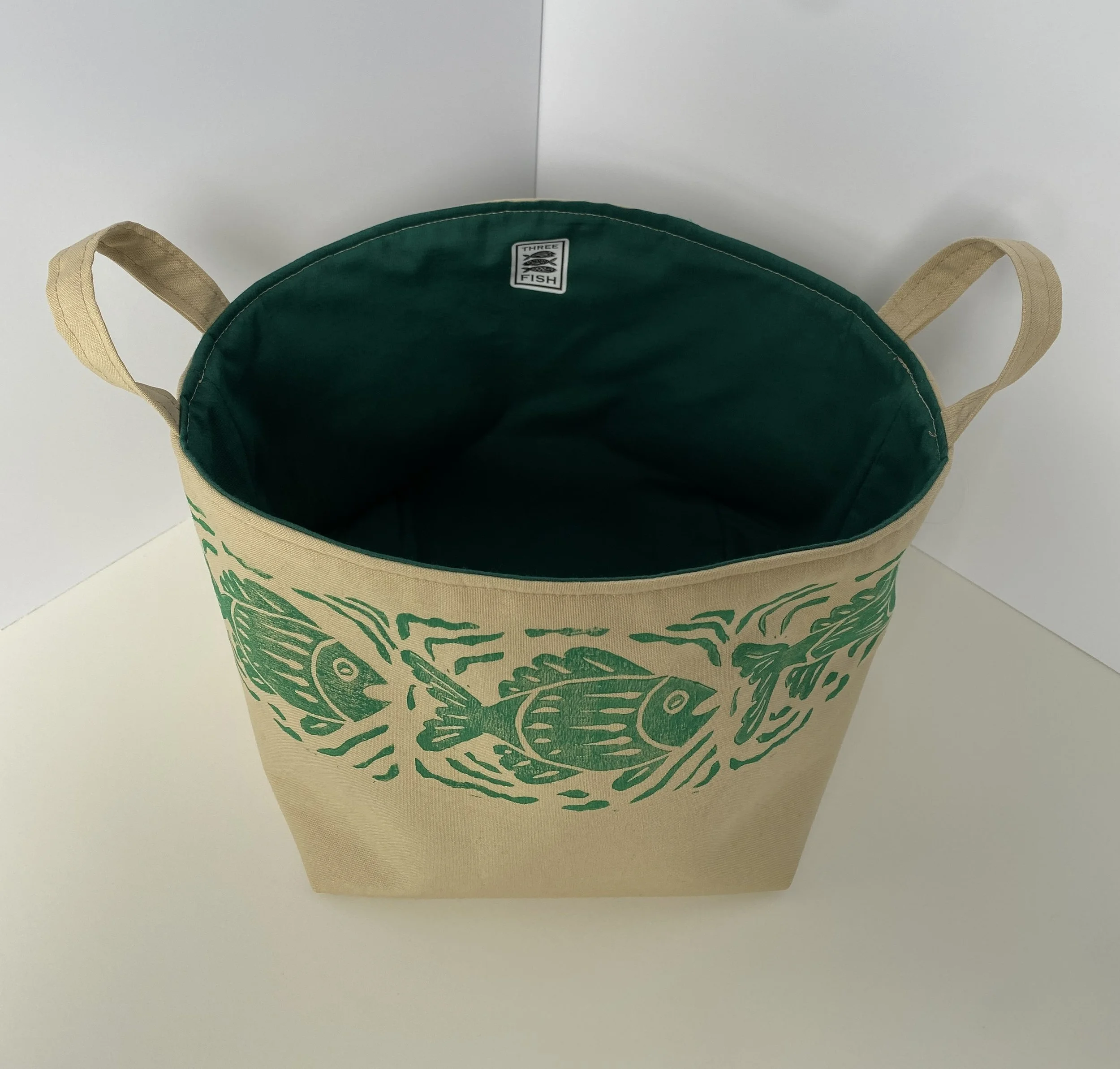 Original handprinted fish design in green. Lined in green fabric. 100% cotton. Machine washable in cold water, air dry. Dimensions: 6”h x 7”w x 7”d