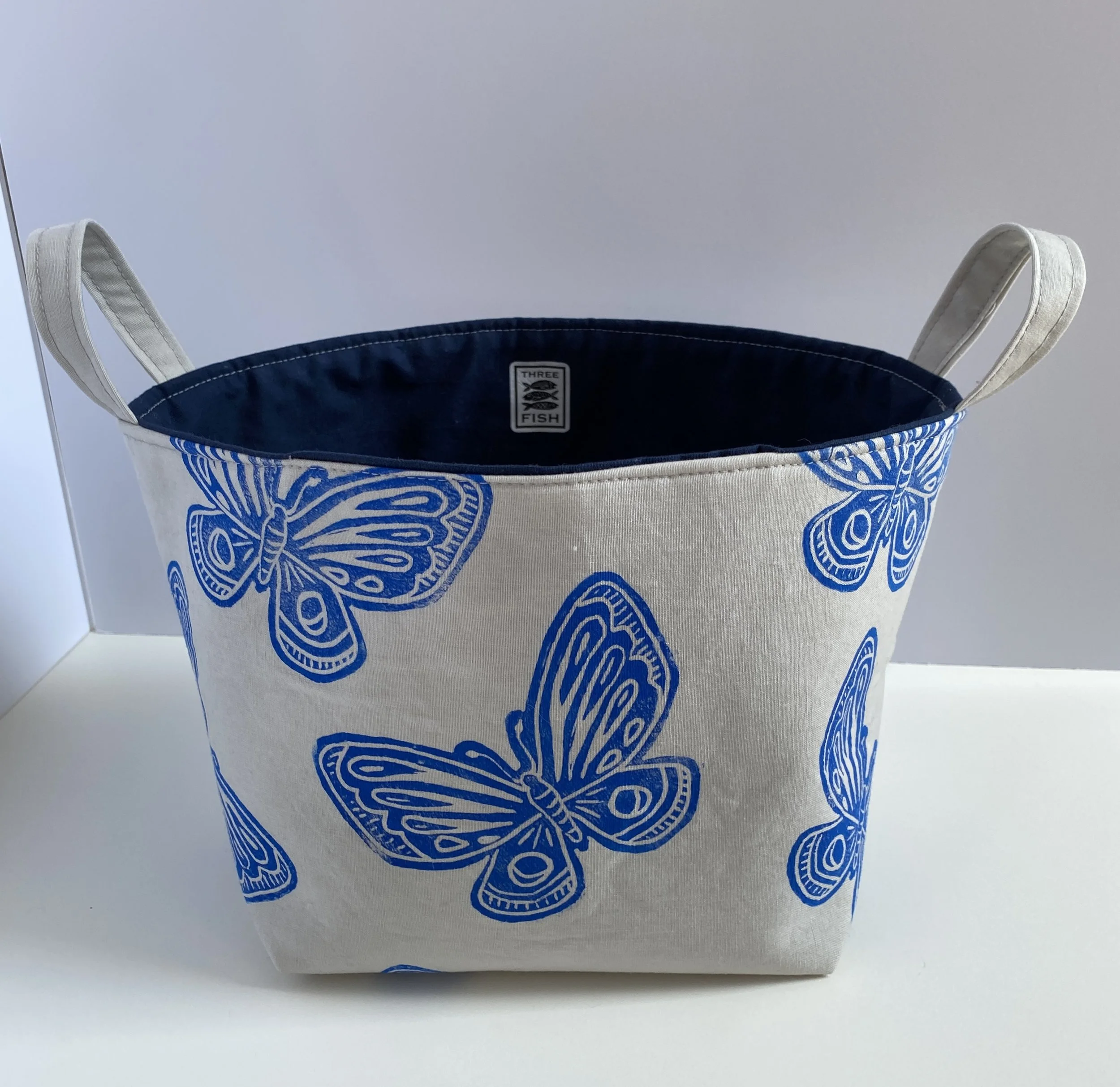 Original handprinted butterfly design in blue. Lined in navy fabric. 100% cotton. Machine washable in cold water, air dry. Dimensions: 6”h x 7”w x 7”d